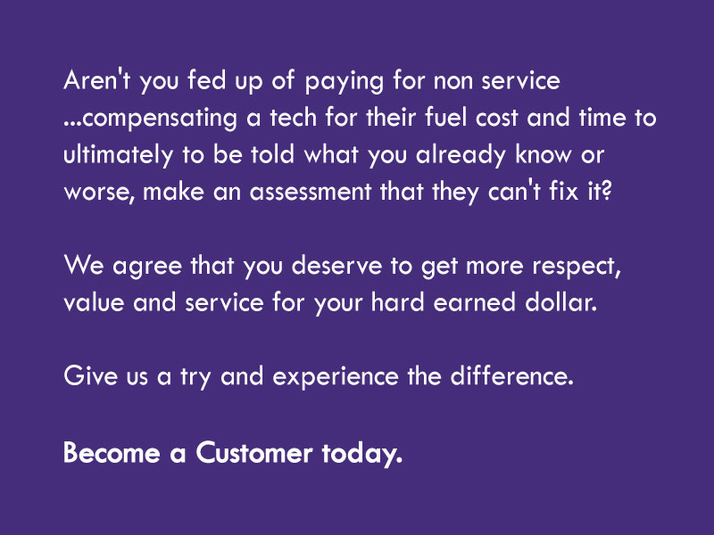 We're all fed up of paying for non service...compensating a tech for their fuel cost and/or time for you to be told what you already know or worse, waste your time for an assessment that they can't fix it but that you still have to pay.
